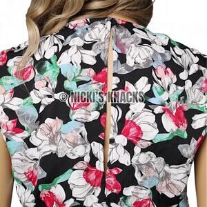 This BCBGMaxazria romper blends playful florals with a polished silhouette. Designed with cap sleeves, a faux wrap front, and a back keyhole with hook-and-eye closure, it features a flattering V-neckline and snap button front. The black base is accented by a vibrant floral print in white, pink, and green. Perfect for warm-weather outings, from brunch to date night.
