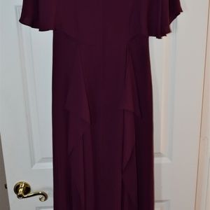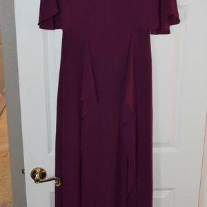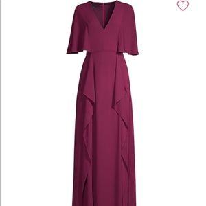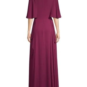 Luxe georgette creates an ethereal silhouette that shifts and billows with every step. Short cape sleeves and elegantly draped ruffle trim heightens this maxi dress's romantic appeal.