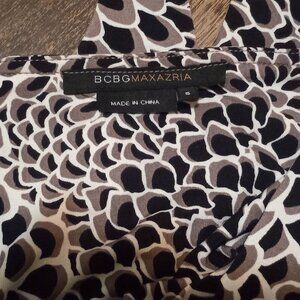 The BCBG Maxazria Halter Dress in Women's Small is a stylish and versatile piece perfect for various occasions. Featuring a geometric pattern in a vibrant multicolor, this knee-length dress is made from a blend of polyester and spandex for added comfort and flexibility. The sleeveless design and halter neckline complete the look for a chic and trendy sundress that is ideal for travel, parties, or casual outings. Perfect for any fashion-forward woman looking to make a statement with their outfit choice.