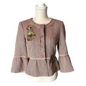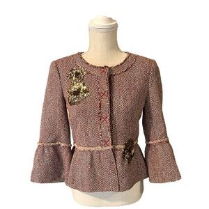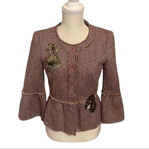 BCBG Maxazria Herringbone Tweed Blazer With Sequin detaining. This is such a gorgeous statement piece with rustic and boho vibes. Multicolor red/black/cream tweed knit with fabric snap button closure and floral sequin embellishment. Tweed fringe accents throughout and bell sleeves. Lined with very light shoulder padding. Excellent condition no rips, holes or stains. Women’s size small