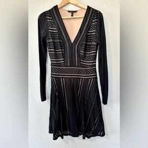 BCBGMaxazria Kinley Luxe Stripe Lace Dress! Long sleeve dress is a striped mesh/lace pattern and is lined in nude through the body to create an illusion of sheerness. Flattering Plunging v-neck. A-line silhouette with a subtle flared hem that falls above the knee. Effortlessly transitions from the office to after hours cocktail party! Excellent condition. Size small. Approximate measurements chest-36” waist-28” hips-40” length-35” Tag black tie, sheer, little black dress, night out smoke free home. ships the next day!