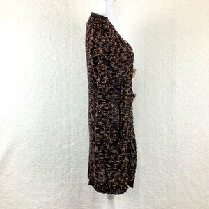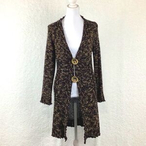 BCBGMaxazria Draped Crochet Cardigan/ Sweater. Women’s size large. Brown, black with yellow highlights. Has 2 chunky buttons. Perfect for chilly nights. Made of 70% acrylic, 30% nylon.