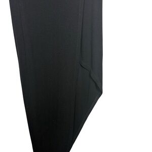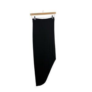 An asymmetrical hemline swirls soft, solid black jersey into a redefined maxi length with a sultry, thigh-grazing section!