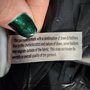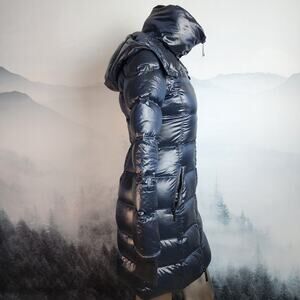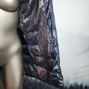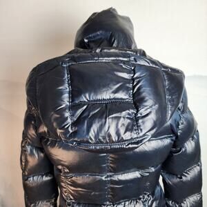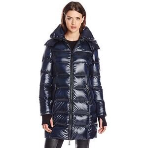 This gorgeous down puffer by BCBGMaxazria is *the* winter coat you need. With a metallic sapphire color and black accents, it doesn't get more stylish than this. It has zipper pockets on either front side plus a pocket on the left arm for ski passes, credit cards, etc. It features a detachable hood and heavy zippers with a puffy down filling so you'll stay warm no matter the condition.