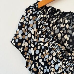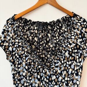 This stylish BCBG Max Azria top features a ruffled V-neckline with smocked elastic detail, creating a flattering and feminine silhouette. The intricate floral pattern in shades of black, white, and brown adds a touch of sophistication. Perfect for a casual day out or a dressed-up evening, this versatile top can be paired with jeans and sandals for a relaxed look or dressed up with a skirt and heels for a more formal occasion.