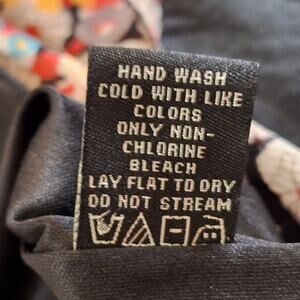 This sleeveless blouse from BCBGMaxazria is in excellent preowned condition-no flaws. Black, Red, Cream, Turquoise, Floral Pattern. Stretchy Nylon with Polyester Lining. V-neck with Empire Waist. Size Large.