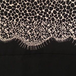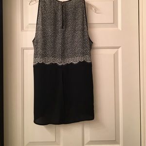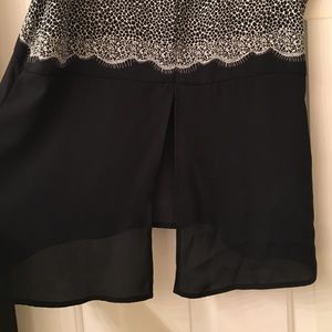 BCBG black and white faux lace top with open back slit. Size Medium. The lace detail is part of the top, not actual lace. 100% polyester. Great for a night out!