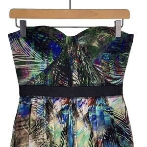 BCBGMaxazria Tae Strapless Silk Maxi Dress 2 Black Peacock Print Sweetheart Gown
