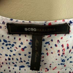 NWT Tara asymmetrical sleeveless dress with v neck. Blue and pink splash dot pattern. Fun ruffles and layers. No issues. Length 37” and back 51”. Polyester