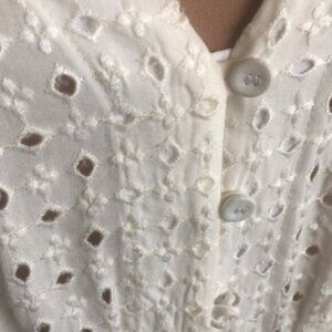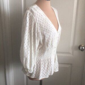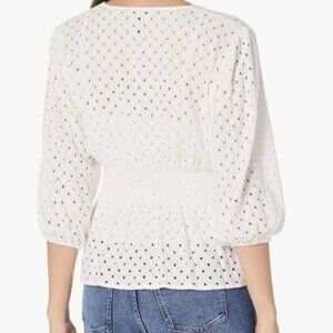 BCBG Maxazria White Top Peplum Blouse Eyelet Button Down