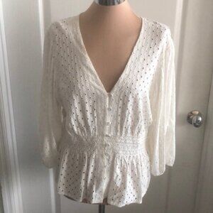 BCBGMaxazria White Top Peplum Blouse Eyelet Button Down Sz. L