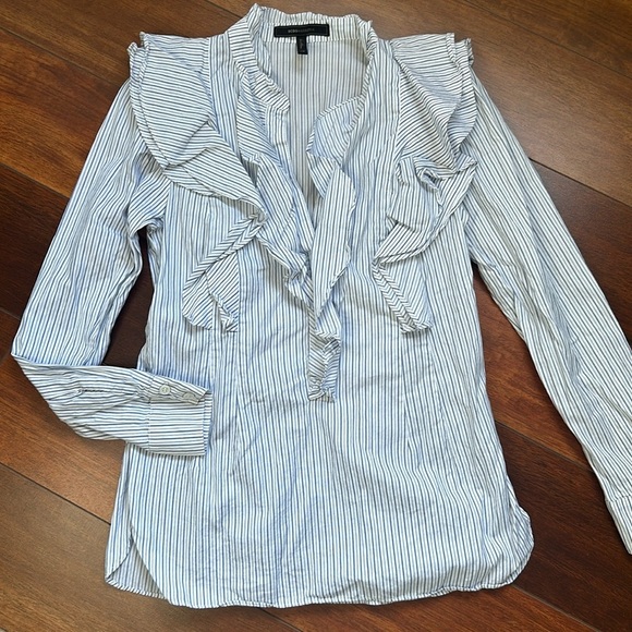 BCBGMaxazria Women’s Ruffle Front Long Sleeve Stripped Blouse XS