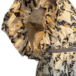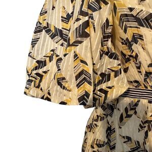 This BCBGMaxazria blouse in size small features a feather print with a sheer design. Made from a cotton and silk blend, it has a wrap style with a belted waist, short balloon sleeves and peplum cut. The blouse is suitable for casual spring occasions and requires dry cleaning.
