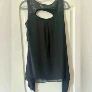 Great quality! Polyester blend. Black layers and lining. Beautiful neckline with sparkle contrast in fabric. Great for holiday parties. Asymmetrical. Layers. No flaws. Women’s XS. Smoke free home