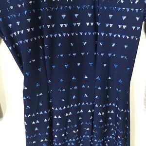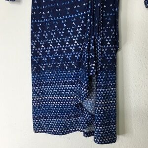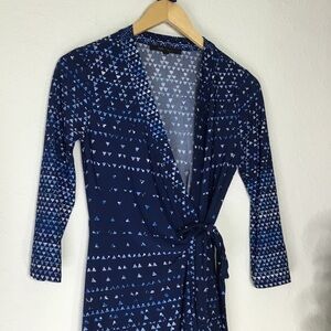 A beautiful wrap dress detailed with a triangular design. Different shades of blue with white. Three quarter sleeves and a tie on the side.