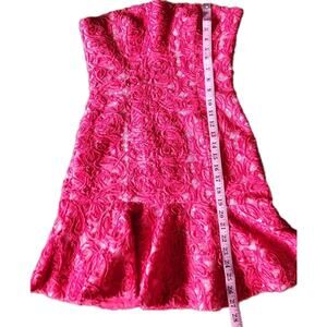 The BCBGMaxazria Y2K Marina Red Mini Strapless Ruffle Hem Dress in size 6 is a stylish and sexy choice for any occasion. With a vibrant red color and floral pattern, this dress features a ruffle hem and a zip closure for a comfortable fit. Made of polyester, this vintage-inspired piece is perfect for weddings, parties, or cocktails, adding a touch of designer flair to your wardrobe. Whether it's for a special event in the winter, summer, fall, or spring, this dress is sure to make a statement.