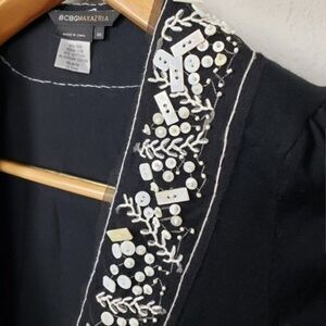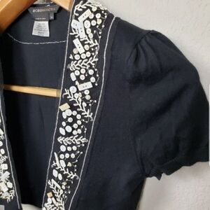 This is a BCBGMAXAZRIA Embellished crop top, embroidered with white buttons around the neck, open cardigan, short sleeves, laced at the front. See last picture has a thread without sewing but it is in EXCELLENT CONDITION