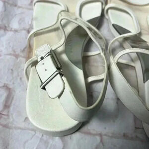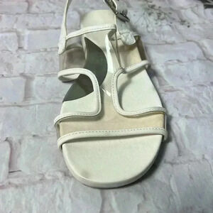 White wedge sandals with trendy clear panels with adjustable silver tone buckles
