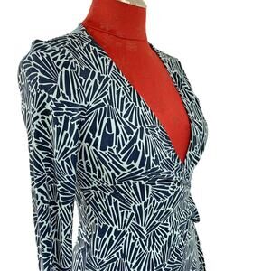 BCBGMaxazria true wrap dress ladies size XS - polyester spandex blend stretch fabric in a black & mint green (looks white in my pics) abstract print. V-neck and 3/4 length fitted sleeves. Cute fit and flare look with a tie waist makes the perfect career dress under a jacket or casual dress on its own. In excellent condition - gently worn - no damage or flaws.