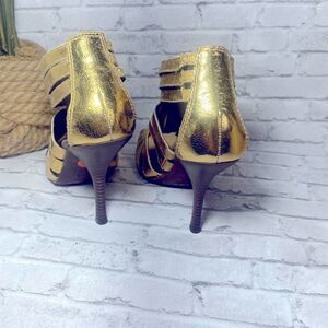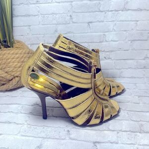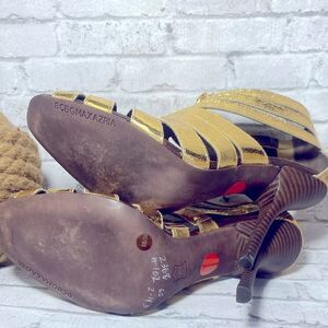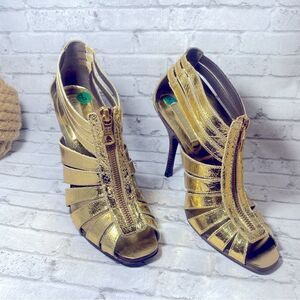 BCBGMaxazria Gold leather "ACELTA" zip front Wooden Heel Sandals Sz 8B