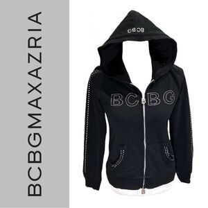 BCBGMaxazria Women’s Black Rhinestone Studded Hoodie. Double rhinestone lines down arms, BCBG rhinestone on front chest and rhinestone lined pockets. BCBG embroidered on hood in silver thread. Double zip closure with 2 rhinestone encrusted “B”’s