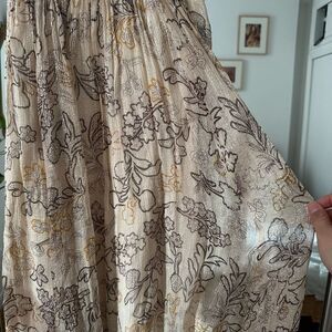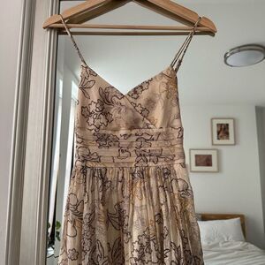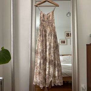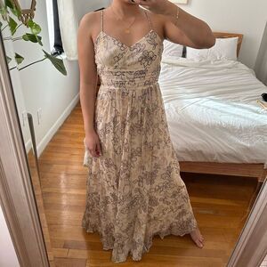 Gorgeous neutral color maxi dress with sheer/ metallic overlay. Spaghetti straps. Hidden back zipper and bow. Cream and brown floral print. Fully lined. Super flattering neckline and flow. Perfect for prom, gala, black tie event.