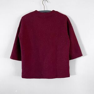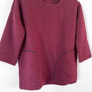 Burgundy sweater/sweatshirt top with an all over textured print. Oversized boxy fit in a pullover style with 3/4 length sleeves and side hand pockets.