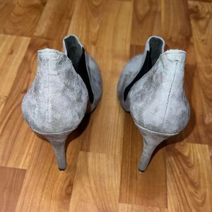 Chic leather heels by BCBG Paris. Features a two-tone design in black and gray.