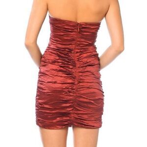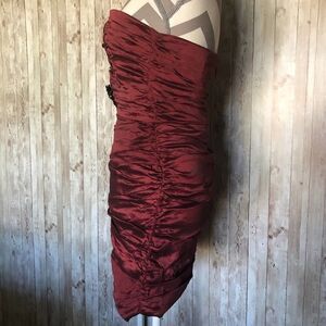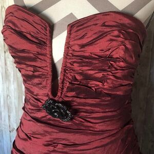 BCBG Tristina Ruby Strapless Dress size 6. Band new with tags, no flaws. Straps included that easily hook on for more support. Taffeta with a subtle metallic shimmer. Strapless ruched design. Concealed back zipper and hook. Jeweled Rose appliqué on chest. Deep v / plunge.