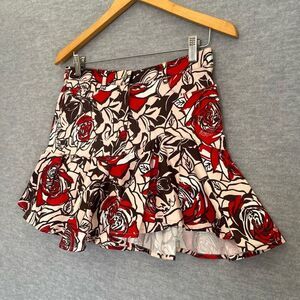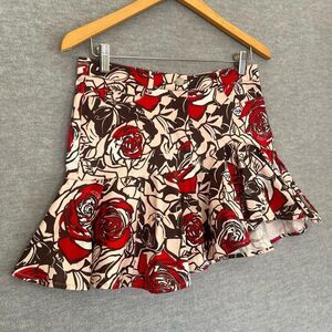 BCBG Y2K Asymmetrical Pleated Mini Skirt Women's 4 Red Brown Roses Dark Romantic