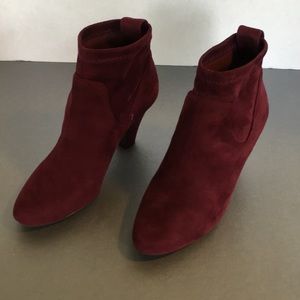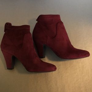 Super comfortable 3” heeled booties in beautiful Bordeaux—this season’s “It” color! Stretchy fabric hugs the ankle, making walking a breeze. Synthetic fabric resembles suede. Hardly worn! Size 5.5 is generous, as I am a 6 and have no trouble fitting these.
