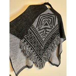 NWT poncho, shrug, cape, cardigan with geometric pattern on back and fringe. Perfect layering piece.