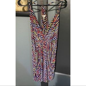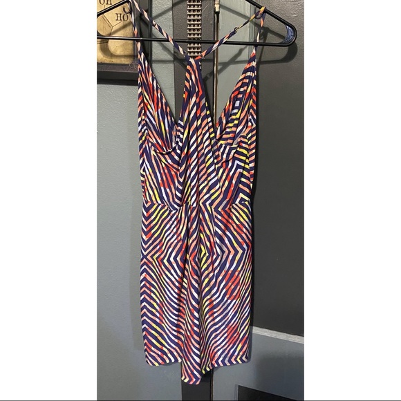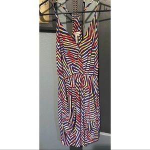 Used but like brand new; has a small hidden button at the breast of dress that makes dress less/more low cut; very cute and colorful zebra print