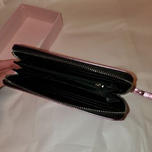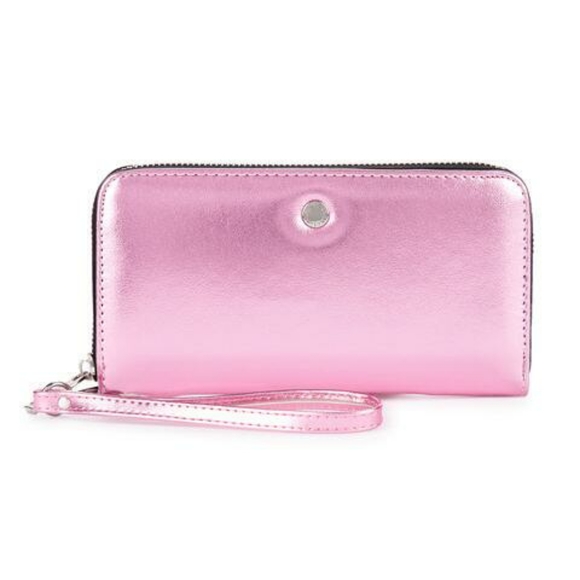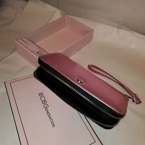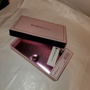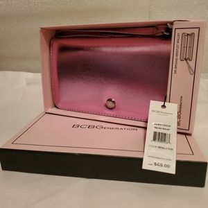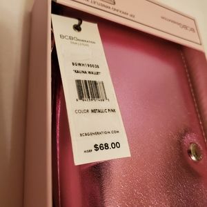New with Tags! BCBGeneration Kalina Zip-Around Wristlet Wallet in metallic pink, zip around closure, removable wristlet strap, anti-corrosion hardware, 8 credit card slots, 2 bill slots, interior zip pocket, lined, vegan leather, measures approx. 2" x 8" zip 5", includes gift box, perfect unused condition!