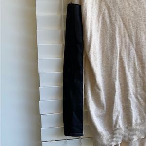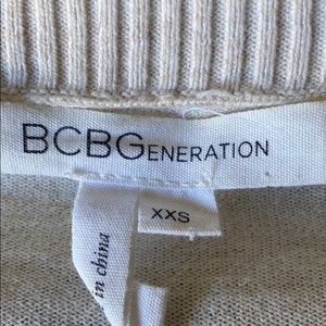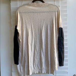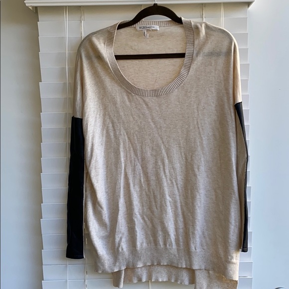 BCBGeneration sweater with half leather sleeve scoop neck. Drops lower in back.