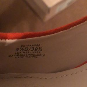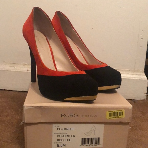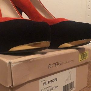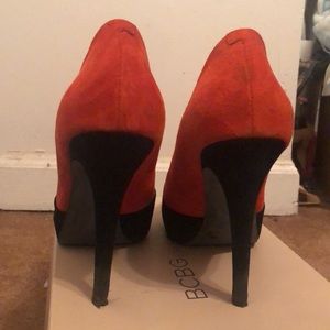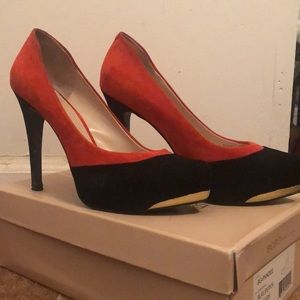 Suede orange & black heels with gold trimming in the front. Very good condition!! Color really pops when paired with black dress, jeans or leggings!
