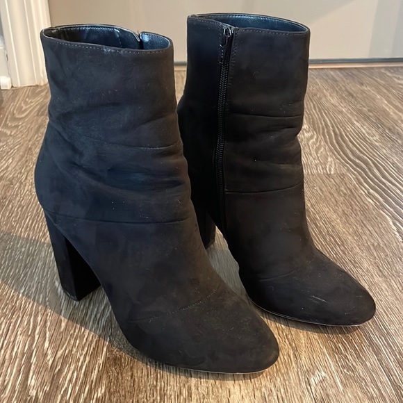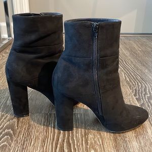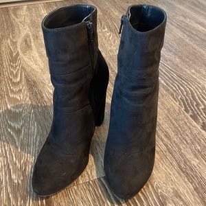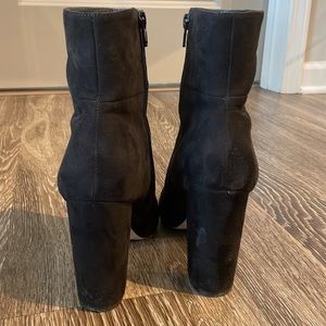 Black suede VEGAN booties with a stacked heel.