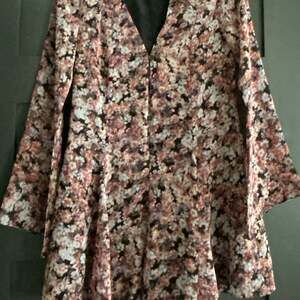 This beautiful dress features an all-over abstract floral print in shades of mauve, cream, and lavender. Designed with a flattering deep V-neckline and long sleeves, it is perfect for transitional weather or a night out.