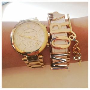 White strap a little worn • AMOR and heart charm are gold and buttons are rose gold • There are a few tiny scratches on the letters, but only noticeable if you look closely