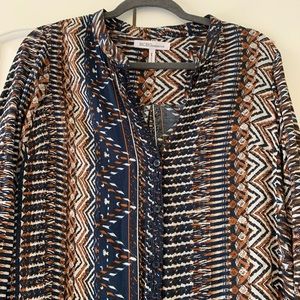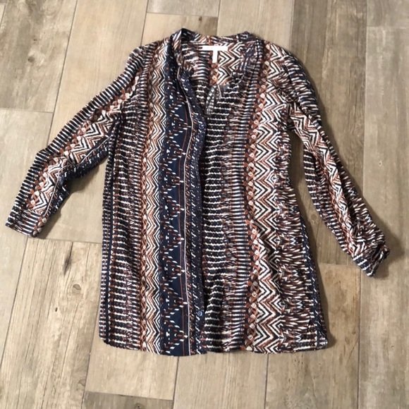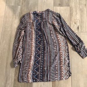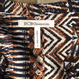 BCBGeneration Aztec Button-Front Dress in size Small. Lightweight material, very comfortable. Aztec print in shades of navy, orange, and white. In good used condition!