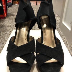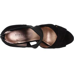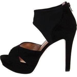 Versatile enough for casual and dress, these BCBGeneration Open Toe, Black Suede Platform Pumps will give you glorious style without skimping on all-day comfort! BG-Havelle Shoes showcases a black suede upper with a stretchy spandex-type fabric around the front of the ankle. Two straps crisscross at the vamp and add to the 1.25-inch platform. A 4 1/2-inch heel finishes off these chic and trendy pumps.