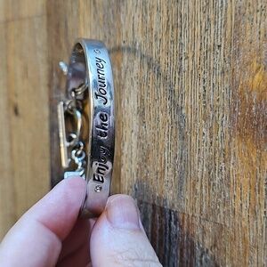 This is a BCBG BCBGeneration Bangle Affirmation Toggle Bracelet- Enjoy the Journey is on the front of the bracelet, toggle clasp and a rhinestone encrusted cactus charm