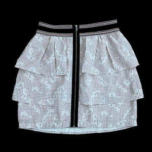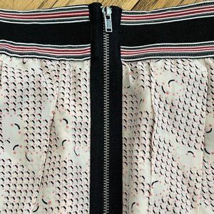 This BCBGeneration mini skirt is a must-have for any fashion-forward woman. Its soft beige, pink, and black, colors along with its geometric and striped pattern, make it the perfect addition to any wardrobe. This lovely pull-on skirt features an elastic waist and front zipper closure, making it easy to wear for any occasion, whether it's for travel, workwear, or a party/cocktail event. The BCBG skirt also boasts layered accents and is lined for a comfortable fit. Its lightweight polyester material makes it perfect for summer, spring, or fall, while its mid-rise and short skirt length create a flattering silhouette. This skirt is versatile enough to fit any style, from bohemian to cottage core, and is sure to turn heads wherever you go. Size Small. Excellent condition.