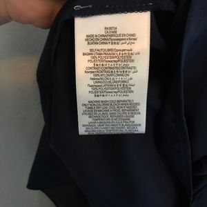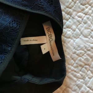 Gorgeous BCBGeneration floor length occasion gown! Navy with black lace detail & strappy back. Only worn once! Slits up sides; sheer bottom half with shorter liner underneath. Perfect for weddings, galas, or events!