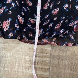 Perfect summer evening dress. Loose fitting, oversized, lightweight semi sheer fabric Black, red and blue floral print, flowy, keyhole back Flutter sleeves, sheath style dress, diagonal stripes Boho, bohemian, black lining underneath, pretty Great to pair with heels or flats for a date night Black Floral Boho Sheath Dress BCBGeneration Small Flutter Sleeve Flowy Dress