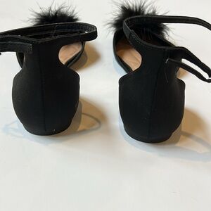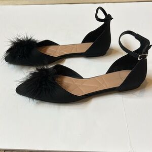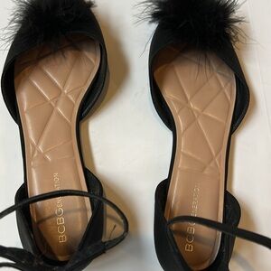 BCBG Kassia Pom Pom Ballet Flats Black. Pointed toe. Adjustable ankle strap. Padded insole. Faux Feather detail. Textile and synthetic upper. Size 9 1/2