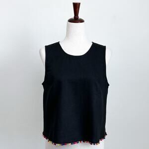 NWT Size Medium BCBGeneration sleeveless top. Black linen blend fabric. Cute and colorful pompom trim along the bottom edge. Keyhole back button closure. Slightly cropped length. No flaws, new with tags!
