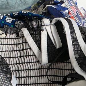 Stylish BCBGeneration strapless-style bubble hem party dress with sheer black mesh overlay and gray lining. Smocked back bodice for comfort fit. Shell 100% nylon; contrast 50% polyester, 47% cotton, 3% spandex; lining 100% acetate. Perfect for cocktail parties, semi-formal events, or night out.