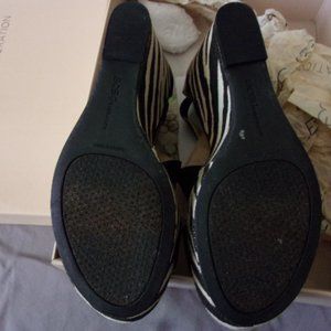 BCBGeneration Black Zebra Patent Leather Wedge, Style - PL-Calibria, Size 8M, Zebra print wedge, patent leather on the back of the heel and over the toe, elastic straps, 3 1/2" heel height, Great Condition.