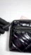 This chic BCBGeneration clutch showcases a glossy black quilted finish paired with a vibrant pink wrist strap, offering a stylish and functional accessory for your essentials.